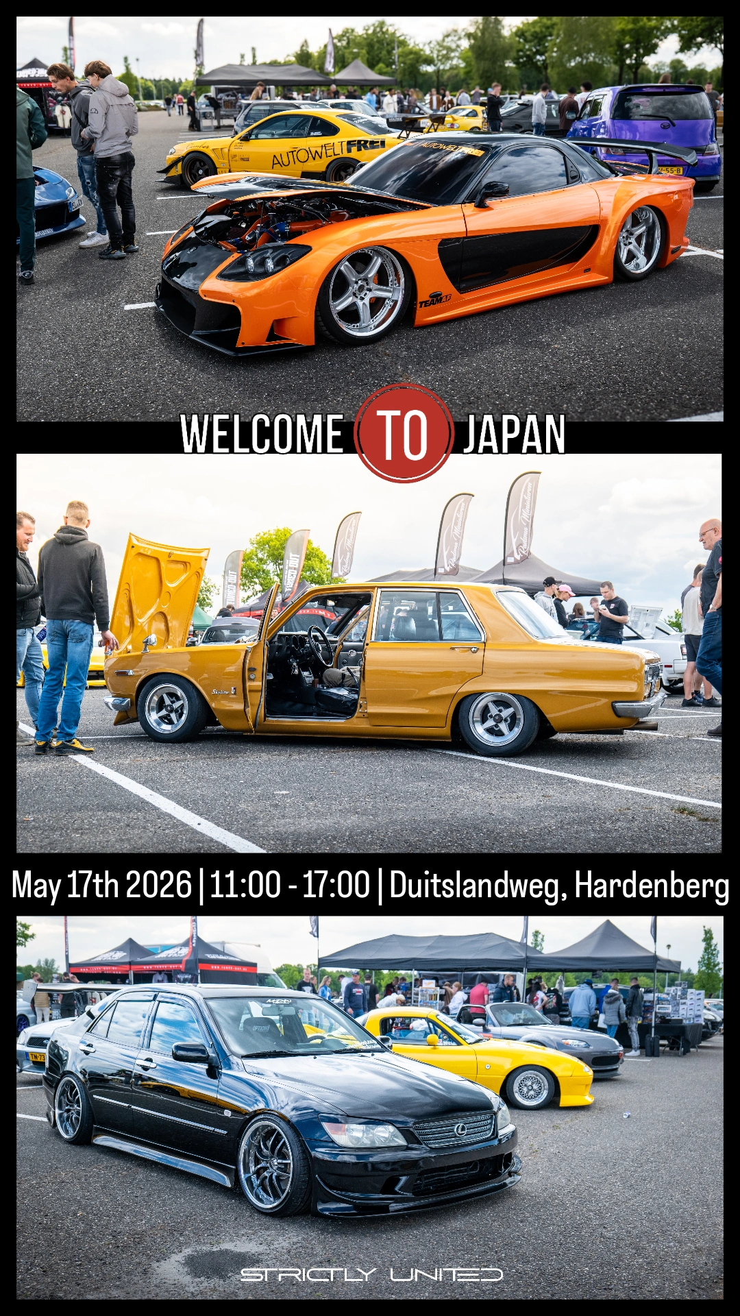 17 Mei 2026 is het weer tijd om te genieten van ons grootste evenement: Welcome to Japan! Het evenement gevuld met: Japanse/Aziatische auto’s en motoren, muziek, verschillende foodtrucks, diverse stands, selection area en een ultieme sfeer!